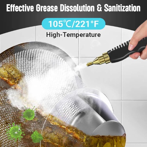 Het vermogen van 2500W genereert stoom tot 105℃ in minder dan 10 seconden, waardoor vet, vuil, stof en vlekken snel van diverse oppervlakken worden verwijderd.