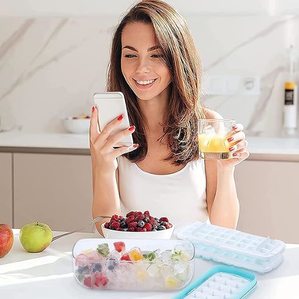 Druk het deksel tegen het bakje en de ijsblokjes komen er vanzelf uit.